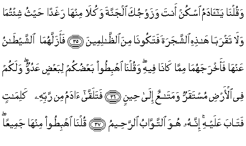 olursunuz." 36.Fakat şeytan, oradan ikisinin ayağını kaydırdı ve böylece onları içinde bulundukları (durum)dan çıkardı. Biz de: "Kiminiz kiminize düşman olarak inin, sizin için yeryüzünde belli bir vakte kadar bir yerleşim ve meta vardır" dedik. 37.Derken Adem, Rabbinden (birtakım) kelimeler aldı. Bunun üzerine (Allah da) tevbesini kabul etti. Şüphesiz O, tevbeleri kabul edendir, esirgeyendir. |
