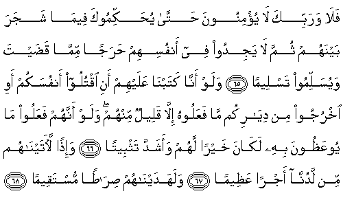 65.Hayır öyle değil; Rabbine andolsun, aralarında çekiştikleri şeylerde seni hakem kılıp sonra senin verdiğin hükme, içlerinde hiçbir sıkıntı duymaksızın, tam bir teslimiyetle teslim olmadıkça, iman etmiş olmazlar. 66.Eğer gerçekten Biz, onlara: "Kendinizi öldürün ya da yurtlarınızdan çıkın" diye yazmış olsaydık, onlardan az bir bölümü dışında, bunu yapmazlardı. Onlar, kendilerine verilen öğüdü yerine getirselerdi, bu şüphesiz onlar için hayırlı ve daha sağlam olurdu. 67.Biz de onlara, o zaman yanımızdan büyük bir ecir verirdik. 68.Ve onları mutlaka dosdoğru yola yöneltip-iletirdik. |