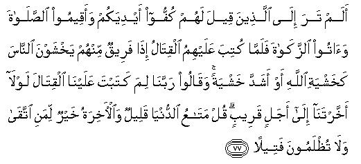 77.Kendilerine; "Elinizi (savaştan) çekin, namazı kılın, zekatı verin" denenleri görmedin mi? Oysa savaş üzerlerine yazıldığında, onlardan bir grup, insanlardan Allah'tan korkar gibi- hatta daha da şiddetli bir korkuyla- korkuya kapılıyorlar ve: "Rabbimiz, ne diye savaşı üzerimize yazdın, bizi yakın bir zamana ertelemeli değil miydin?" dediler. De ki: "Dünyanın metaı azdır, ahiret, ise muttakiler için daha hayırlıdır ve siz 'bir hurma çekirdeğindeki ip-ince bir iplik kadar' bile haksızlığa uğratılmayacaksınız." |