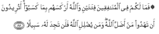 88.Şu halde münafıklar konusunda ikiye bölünmeniz ne diye? Oysa Allah, onları kazandıkları dolayısıyla tepe taklak etmiştir. Allah'ın saptırdığını hidayete erdirmek mi istiyorsunuz? Allah kimi saptırırsa, artık sen ona kesin olarak bir yol bulamazsın. |