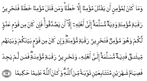 92.Bir mü'mine, -hata sonucu olması dışında- bir başka mü'mini öldürmesi yakışmaz. Kim bir mü’mini 'hata sonucu' öldürürse, mü'min bir köleyi özgürlüğüne kavuşturması ve ailesine teslim edilecek bir diyeti vermesi gerekir. Onların (bunu) sadaka olarak bağışlamaları başka. Eğer o, mü'min olduğu halde size düşman olan bir topluluktan ise, bu durumda mü'min bir köleyi özgürlüğe kavuşturması gerekir. Şayet kendileriyle aranızda andlaşma olan bir topluluktan ise, bu durumda ailesine bir diyet ödemek ve bir mü'min köleyi özgürlüğe kavuşturmak gerekir. (Diyet ve köle özgürlüğü için gereken imkanı) Bulamayan ise, kesintisiz olarak iki ay oruç tutmalıdır. Bu, Allah'tan bir tevbedir. Allah bilendir, hüküm ve hikmet sahibidir. |