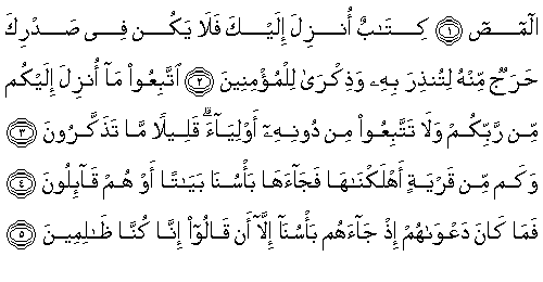 2.(Bu,) Bir Kitap'tır ki onunla uyarman için ve mü'minlere bir öğüt olmak üzere sana indirildi. Öyleyse bundan dolayı göğsünde bir sıkıntı olmasın. 3.Rabbinizden size indirilene uyun, O'ndan başka velilere uymayın. Ne az öğüt alıyorsunuz? 4.Biz nice ülkeleri yıkıma uğrattık. Geceleri uyurlarken ya da gündüzün dinlenirlerken Bizim zorlu azabımız onlara geliverdi. 5.Zorlu azabımız onlara gelince yakarabildikleri: "Biz gerçekten zulme sapanlardandık" demelerinden başka olmadı. |
