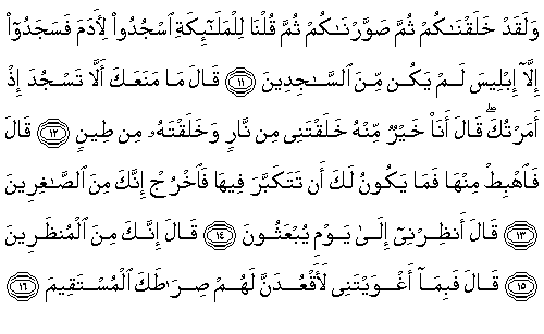 ettiler; o, secde edenlerden olmadı. 12.(Allah) Dedi: "Sana emrettiğimde, seni secde etmekten alıkoyan neydi?" (İblis) Dedi ki: "Ben ondan hayırlıyım; beni ateşten yarattın, onu ise çamurdan yarattın." 13.(Allah:) "Öyleyse oradan in, orda büyüklenmen senin (hakkın) olmaz. Hemen çık. Gerçekten sen, küçük düşenlerdensin." 14.O da: "(İnsanların) dirilecekleri güne kadar beni gözle(yip ertele.)" dedi. 15. (Allah:) "Sen gözlenip-ertelenenlerdensin" dedi. 16.Dedi ki: "Madem öyle, beni azdırdığından dolayı onlar(ı insanları saptırmak) için mutlaka Senin dosdoğru yolunda (pusu kurup) oturacağım." |