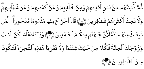 sollarından sokulacağım. Onların çoğunu şükredici bulmayacaksın." 18.(Allah) Dedi: "Kınanıp alçaltılmış ve kovulmuş olarak oradan çık. Andolsun, onlardan kim seni izlerse, cehennemi sizlerle dolduracağım." 19.Ve ey Adem, sen ve eşin cennete yerleş. İkiniz dilediğiniz yerden yiyin; ama şu ağaca yaklaşmayın. Yoksa zalimlerden olursunuz. |
