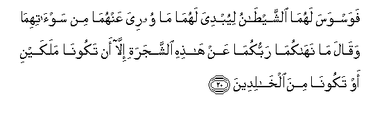| 20.Şeytan, kendilerinden 'örtülüp gizlenen çirkin yerlerini' açığa çıkarmak için onlara vesvese verdi ve dedi ki: "Rabbinizin size bu ağacı yasaklaması, yalnızca, sizin iki melek olmamanız veya ebedi yaşayanlardan kılınmamanız içindir." | ![]() |