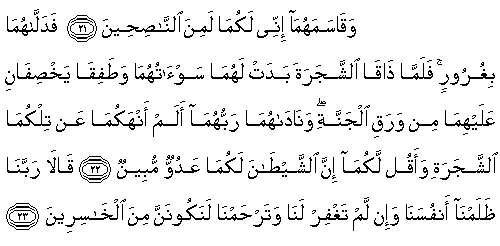 etti. 22.Böylece onları aldatarak düşürdü. Ağacı tattıkları anda ise, ayıp yerleri kendilerine beliriverdi ve üzerlerini cennet yapraklarından örtmeye başladılar. (O zaman) Rableri kendilerine seslendi: "Ben sizi bu ağaçtan menetmemiş miydim? Ve şeytanın sizin gerçekten apaçık bir düşmanınız olduğunu söylememiş miydim? 23.Dediler ki: "Rabbimiz, biz nefislerimize zulmettik, eğer bizi bağışlamazsan ve esirgemezsen, gerçekten hüsrana uğrayanlardan olacağız." |