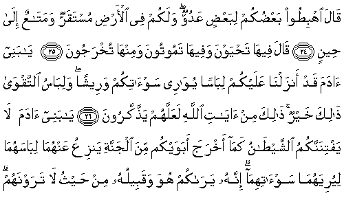 (geçim) vardır." 25.Dedi ki: "Orda yaşayacak, orda ölecek ve oradan çıkarılacaksınız." 26.Ey Ademoğulları, Biz sizin çirkin yerlerinizi örtecek bir elbise ve size 'süs kazandıracak bir giyim' indirdik (var ettik). Takva ile kuşanıp-donanmak ise, bu daha hayırlıdır. Bu, Allah'ın ayetlerindendir. Umulur ki öğüt alıp-düşünürler. |