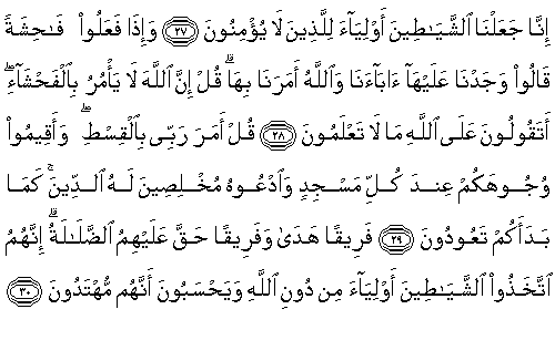 görmektedir. Biz gerçekten şeytanları, inanmayacakların dostları kıldık. 28.Onlar, 'çirkin bir hayasızlık' işlediklerinde: "Biz atalarımızı bunun üzerinde bulduk. Allah bunu bize emretti" derler. De ki: "Şüphesiz Allah, 'çirkin hayasızlıkları' emretmez. Bilmediğiniz bir şeyi Allah'a karşı mı söylüyorsunuz?" 29.De ki: "Rabbim adaletle davranmayı emretti. Her mescid yanında (secde yerinde) yüzlerinizi (O'na) doğrultun ve dini yalnız Kendisi'ne has kılarak O'na dua edin. "Başlangıçta sizi yarattığı" gibi döneceksiniz." 30.Kimine hidayet verdi, kimi de sapıklığı hak etti. Çünkü bunlar, Allah'ı bırakıp şeytanları veli edinmişlerdi. Ve gerçekten onları doğru yolda saymaktadırlar. |
