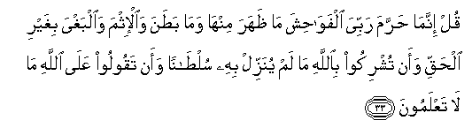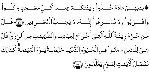 32.De ki: "Allah'ın kulları için çıkardığı ziyneti ve temiz rızıkları kim haram kılmıştır?" De ki: "Bunlar, dünya hayatında iman edenler içindir, kıyamet günü ise yalnızca onlarındır." Bilen bir topluluk için ayetleri böyle birer birer açıklarız. |
