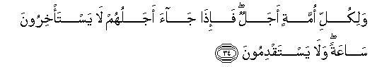 | 34.Her ümmet için bir ecel vardır. Onların ecelleri gelince, ne bir saat ertelenebilirler ne de öne alınabilirler (tam zamanında çökerler.) |