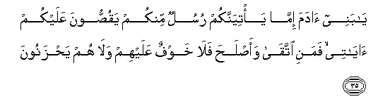 | 35.Ey Ademoğulları, içinizden size ayetlerimi haber veren elçiler geldiğinde, kim sakınırsa ve (davranışlarını) düzeltirse işte onlar için korku yoktur, onlar mahzun olmayacaklardır. | ![]() |