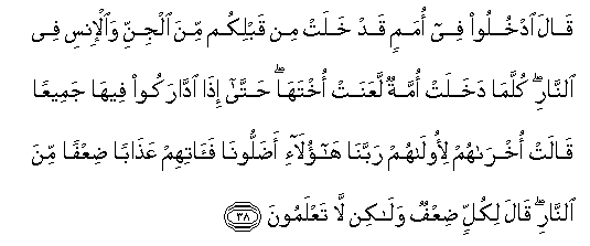 | 38.(Allah) diyecek: "Cinlerden ve insanlardan sizden önce geçmiş ümmetlerle birlikte ateşe girin." Her bir ümmet girişinde kardeşini (kendi benzerini) lanetler. Nitekim hepsi birbiri ardınca orada toplanınca, en sonra yer alanlar, en önde gelenler için: "Rabbimiz, işte bunlar bizi saptırdı; öyleyse ateşten kat kat artırılmış bir azap ver diyecekler. (Allah da:) "Hepsi için kat kattır. Ancak siz bilmezsiniz" diyecek. | ![]() |