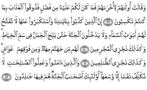40.Şüphesiz ayetlerimizi yalanlayanlar ve onlara karşı büyüklenenler, onlar için göğün kapıları açılmaz ve halat (ya da deve) iğnenin deliğinden geçinceye kadar cennete girmezler. Biz suçlu-günahkarları işte böyle cezalandırırız. 41.Onlar için cehennemden yataklar ve üstlerine örtüler vardır. Biz zulme sapanları işte böyle cezalandırırız. 42.İman edenler ve salih amellerde bulunanlar -ki Biz hiç kimseye güç yetireceğinden fazlasını yüklemeyiz- onlar da cennetin ashabı (halkı)dırlar. Onda sonsuz olarak kalacaklardır. |