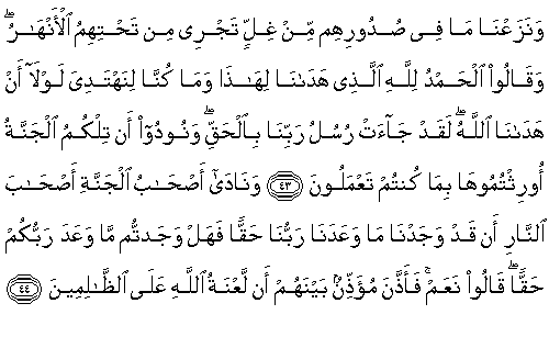 seslenilecek. 44.Cennet halkı, ateş halkına (şöyle) seslenecekler: "Bize Rabbimiz'in vadettiğini gerçek buldunuz mu?" Onlar da: "Evet" derler. Bundan sonra içlerinden seslenen biri (şöyle) seslenecektir: "Allah'ın laneti zalimlerin üzerine olsun." |