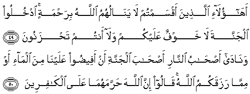 Sizin için korku yoktur ve mahzun olmayacaksınız." 50.Ateşin halkı cennet halkına seslenir: “Bize biraz sudan ya da Allah’ın size verdiği rızıktan aktarın.” Derler ki: “Doğrusu Allah, bunları inkar edenlere haram (yasak) kılmıştır.” |