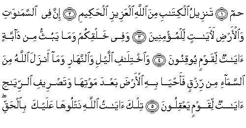 1.Ha, Mim. 2.Kitab'ın indirilmesi, üstün ve güçlü olan, hüküm ve hikmet sahibi Allah'tandır. 3.Şüphesiz, mü'minler için göklerde ve yerde ayetler vardır. 4.Sizin yaratılışınızda ve türetip-yaydığı canlılarda kesin bilgiyle inanan bir kavim için ayetler vardır. 5.Gece ile gündüzün ardarda gelişinde (veya aykırılığında), Allah'ın gökten rızık indirip ölümünden sonra yeryüzünü diriltmesinde ve rüzgarları (belli bir düzen içinde) yönetmesinde aklını kullanan bir kavim için ayetler vardır. |