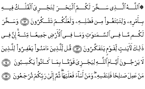 13. Kendinden (bir nimet olarak) göklerde ve yerde olanların tümüne sizin için boyun eğdirdi. Şüphesiz bunda, düşünebilen bir kavim için gerçekten ayetler vardır. 14. İman edenlere de ki: "(Allah'ın) Onları kazandıklarıyla cezalandırması için, Allah'ın günlerini ummayanları (şimdilik) bağışlasınlar." 15.Kim salih bir amelde bulunursa, kendi lehinedir, kim kötülük yaparsa, artık o da kendi aleyhinedir. Sonra siz Rabbinize döndürüleceksiniz. |