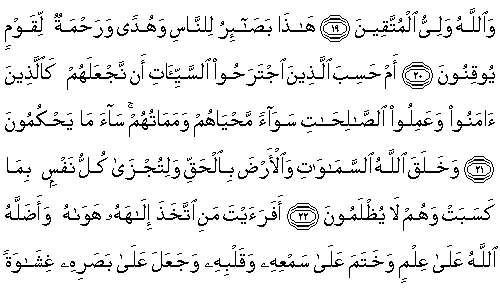 20. Bu (Kur'an), insanlar için basiret (nuruyla Allah'a yönelten ayet)lerdir, kesin bilgiyle inanan bir kavim için de bir hidayet ve bir rahmettir. 21.Yoksa kötülüklere batıp-yara alanlar, kendilerini iman edip salih amellerde bulunanlar gibi kılacağımızı mı sandılar? Hayatları ve ölümleri bir mi (olacak)? Ne kötü hüküm veriyorlar. 22.Allah, gökleri ve yeri hak olarak yarattı; öyle ki, her nefis kazandıklarıyla karşılık görsün. Onlara zulmedilmez. |