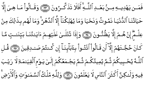 24. Dediler ki: "(Bütün olup biten,) Bu dünya hayatımızdan başkası değildir, ölürüz ve diriliriz; bizi "kesintisi olmayan zaman' (dehrin akışın)dan başkası yıkıma (helake) uğratmıyor." Oysa onların bununla ilgili hiçbir bilgileri yoktur; yalnızca zannediyorlar. 25.Onlara açık belgeler olarak ayetlerimiz okunduğu zaman, onların (sözde) delilleri: "Eğer doğru sözlüler iseniz, atalarımızı (diriltip) getirin" demekten başkası değildir. 26.De ki: "Allah sizi diriltiyor, sonra sizi öldürüyor, sonra kendisinde hiçbir kuşku olmayan kıyamet günü O sizi biraraya getirip-toplayacaktır. Ancak insanların çoğu bilmezler." |