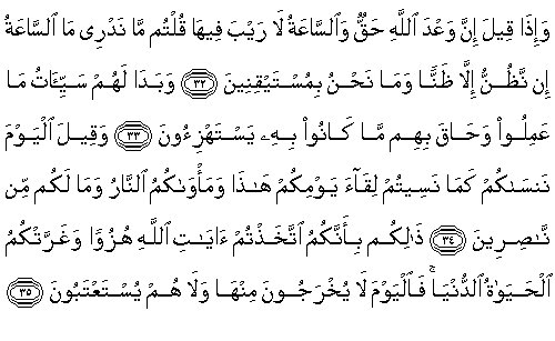 33. Onların yaptıkları şeylerin kötülüğü kendileri için açığa çıktı ve alay konusu edindikleri de onları sarıp-kuşattı. 34. Denildi ki: "Bugününüzle karşılaşmayı unuttuğunuz gibi, Biz de sizi bugün unutuyoruz. Barınma yeriniz ateştir. Ve sizin için hiçbir yardımcı yoktur." 35. "Bunun nedeni şudur: Çünkü siz Allah'ın ayetlerini alay konusu edindiniz; dünya hayatı da sizi aldattı." Böylece ne ordan (ateşten) çıkarılırlar, ne (Allah'tan) hoşnutluk dilekleri kabul edilir. |