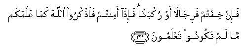 239.Eğer korkarsanız, yaya veya binekte iken kılın. Güvenliğe girdiğinizde ise, yine Allah'ı, bilmediğiniz şeyleri size öğrettiği gibi zikredin. | ![]() |