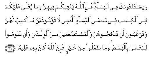 127.Kadınlar konusunda senden fetva isterler. De ki: "Onlara ilişkin fetvayı size Allah veriyor. (Bu fetva,) Kendilerine yazılan (hakları veya miras)ı vermediğiniz ve kendilerini nikahlamayı istediğiniz yetim kadınlar ve zayıf çocuklar (hakkında) ile yetimlere karşı adaleti ayakta tutmanız konusunda size kitapta okunmakta olanlardır. Hayır adına her ne yaparsanız, şüphesiz Allah onu bilir. | ![]() |