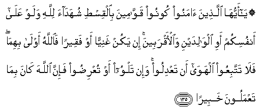 135.Ey iman edenler, kendiniz, anne-babanız ve yakınlarınız aleyhine bile olsa, Allah için şahidler olarak adaleti ayakta tutun. (Onlar) ister zengin olsun, ister fakir olsun; çünkü Allah onlara daha yakındır. Öyleyse adaletten dönüp heva (tutkuları)nıza uymayın. Eğer dilinizi eğip büker (sözü geveler) ya da yüz çevirirseniz, şüphesiz Allah, yaptıklarınızdan haberi olandır. | ![]() |