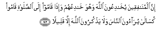 142.Gerçek şu ki, münafıklar (sözde), Allah'ı aldatmaktadırlar. Oysa O, onları aldatandır. Namaza kalktıkları zaman, isteksizce kalkarlar. İnsanlara gösteriş yaparlar ve Allah'ı ancak çok az anarlar. | ![]() |