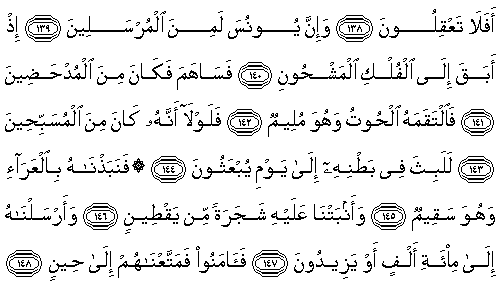 geceleyin. Yine de akıllanmayacak mısınız? 139. Şüphesiz Yunus da gönderilmiş (elçi)lerdendi. 140.Hani o, dolu bir gemiye kaçmıştı. 141.Böylece kur’aya katılmıştı da, kaybedenlerden olmuştu. 142. Derken onu balık yutmuştu, oysa o kınanmıştı. 143.Eğer (Allah’ı çokça) tesbih edenlerden olmasaydı, 144.Onun karnında (insanların) dirilip-kaldırılacakları güne kadar kalakalmıştı. 145.Sonunda o hasta bir durumdayken çıplak bir yere (sahile) attık. 146.Ve üzerine, sık-geniş yaprakla (kabağa benzer) türden bir ağaç bitirdik. 147. Onu yüzbin veya (sayısı) daha da artan (bir topluluk)a (peygamber olarak) gönderdik. 148. Sonunda ona iman ettiler, Biz de onları bir süreye kadar yararlandırdık. |