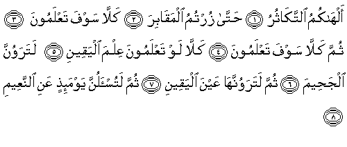 1.(Mal, mülk ve servette) Çoklukla övünmek, sizi 'tutkuyla oyalayıp, kendinizden geçirdi.' 2."Öyle ki (bu,) mezarı ziyaretinize (kabre gidişinize, ölümünüze) kadar sürdü." 3.Hayır; ileride bileceksiniz. 4.Yine hayır; ileride bileceksiniz. 5.Hayır; eğer siz kesin bir bilgiyle bilmiş olsaydınız, 6.Andolsun, o çılgınca yanan ateşi de elbette görecektiniz. 7.Sonra onu, gerçekten yakîn gözüyle (Ayne'l Yakîn) görmüş olacaksınız. 8.Sonra o gün, nimetten sorguya çekileceksiniz. |
