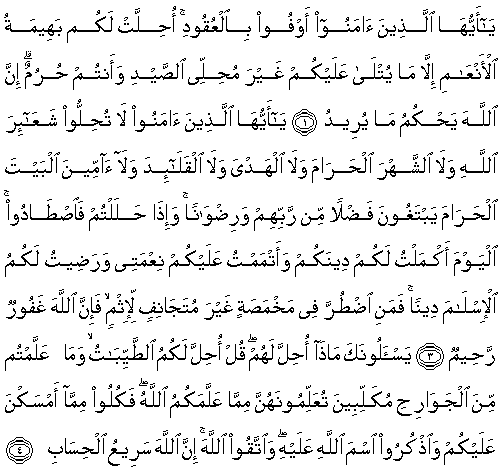 Ey iman edenler, akitleri yerine getirin. İhramlı iken avlanmayı helal saymaksızın ve size okunacaklar dışta tutulmak üzere, hayvanlar size helal kılındı. Şüphesiz Allah, dilediği hükmü verir.