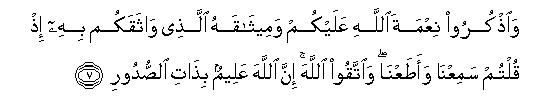 7.Allah'ın üzerinizdeki nimetini ve: "İşittik ve itaat ettik" dediğinizde sizi, kendisiyle bağladığı sözünü (misakını) anın. Allah'tan korkup-sakının. Şüphesiz Allah, sinelerin özünde olanı bilendir.