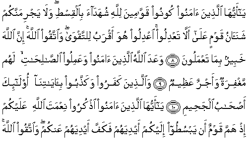 8. Ey iman edenler, adil şahidler olarak, Allah için, hakkı ayakta tutun. Bir topluluğa olan kininiz, sizi adaletten alıkoymasın. Adalet yapın. O, takvaya daha yakındır. Allah'tan korkup-sakının. Şüphesiz Allah, yapmakta olduklarınızdan haberi olandır.