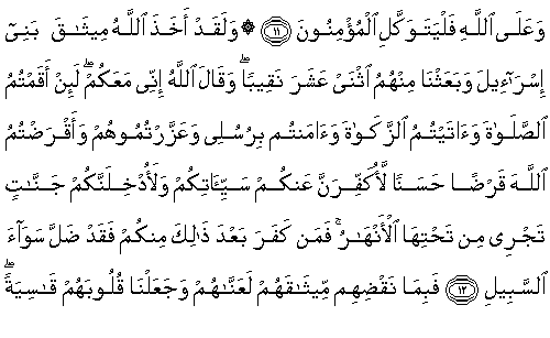 12.Andolsun, Allah İsrailoğulları'ndan kesin söz (misak) almıştı. Onlardan on iki güvenilir- gözetleyici göndermiştik. Ve Allah onlara: "Gerçekten Ben sizinle birlikteyim. Eğer namazı kılar, zekatı verir, elçilerime inanır, onları savunup-desteklerseniz ve Allah'a güzel bir borç verirseniz, şüphesiz sizin kötülüklerinizi örter ve sizi gerçekten, altından ırmaklar akan cennetlere sokarım. Bundan sonra sizden kim inkar ederse, cidden dümdüz bir yoldan sapmıştır."