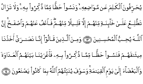 13.Sözleşmelerini bozmaları nedeniyle, onları lanetledik ve kalplerini kaskatı kıldık. Onlar, kelimeleri konuldukları yerlerden saptırırlar. (Sık sık) Kendilerine hatırlatılan şeyden (yararlanıp) pay almayı unuttular. İçlerinden birazı dışında, onlardan sürekli ihanet görür durursun. Yine de onları affet, aldırış etme. Şüphesiz Allah, iyilik yapanları sever.