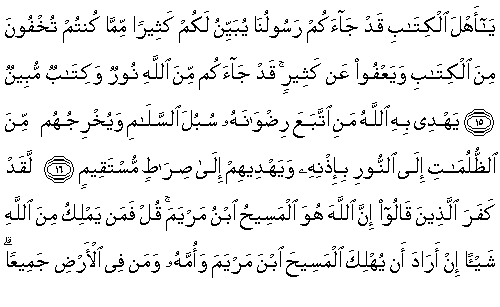 15. Ey Kitap Ehli, kitaptan gizlemekte olduklarınızın çoğunu size açıklayan ve birçoğundan geçiveren elçimiz geldi. Size Allah'tan bir nur ve apaçık bir kitap geldi.