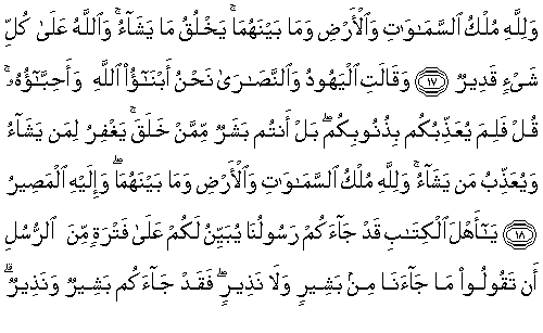 18. Yahudi ve Hıristiyanlar: "Biz Allah'ın çocuklarıyız ve sevdikleriyiz" dedi. De ki: "Peki, ne diye sizi günahlarınızdan dolayı azaplandırıyor? Hayır, siz O'nun yarattığından birer beşersiniz. O, dilediğini bağışlar, dilediğini azaplandırır. Göklerin, yerin ve bunların arasındakilerin tümünün mülkü Allah'ındır. Son varış O'nadır."