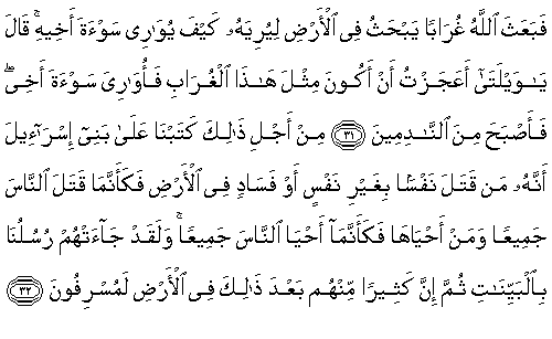 31. Derken, Allah, ona, yeri eşeleyerek kardeşinin cesedini nasıl gömeceğini gösteren bir karga gönderdi. "Bana yazıklar olsun" dedi. "Şu karga kadar olup da kardeşimin cesedini gömmekten aciz miyim?" Artık o, pişman olmuştu.