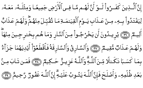 36. Gerçek şu ki, inkar edenler, yeryüzünde olanların tümü ve bununla birlikte bir katı daha onların olsa, bununla da kıyamet gününün azabından (kurtulmak için) fidye vermeye kalkışsalar, yine onlardan kabul edilmez. Onlar için acı bir azap vardır.