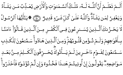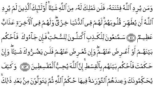 Ey peygamber, kalpleri inanmadığı halde ağızlarıyla "İnandık" diyenlerle Yahudilerden küfür içinde çaba harcayanlar seni üzmesin. Onlar, yalana kulak tutanlar, sana gelmeyen diğer topluluk adına kulak tutanlar (haber toplayanlar)dır. Onlar, kelimeleri yerlerine konulduktan sonra saptırırlar, "Size bu verilirse onu alın, o verilmezse ondan kaçının" derler. Allah, kimin fitne(ye düşme)sini isterse, artık onun için sen Allah'tan hiçbir şeye malik olamazsın. İşte onlar, Allah'ın kalplerini arıtmak istemedikleridir. Dünyada onlar için bir aşağılanma, ahirette onlar için büyük bir azap vardır.