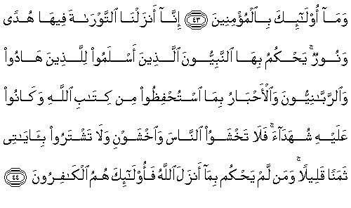 44. Gerçek şu ki, Biz Tevrat’ı, içinde bir hidayet ve nur olarak indirdik. Teslim olmuş peygamberler, Yahudilere onunla hükmederlerdi. Bilgin-yöneticiler (Rabbaniyun) ve yüksek bilginler de (Ahbar), Allah'ın Kitabı’nı korumakla görevli kılındıklarından ve onun üzerine şahidler olduklarından (onunla hükmederlerdi.) Öyleyse insanlardan korkmayın, Benden korkun ve ayetlerimi az bir değere karşılık satmayın. Kim Allah'ın indirdiğiyle hükmetmezse, işte onlar, kafir olanlardır.