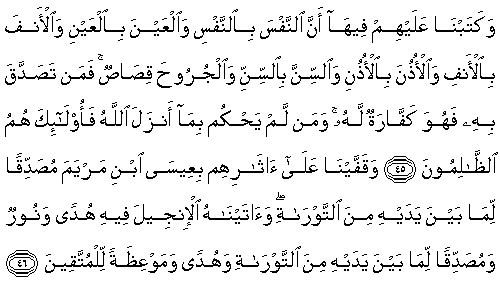 45. Biz onda, onların üzerine yazdık: Cana can, göze göz, buruna burun, kulağa kulak, dişe diş ve (bütün) yaralara (karşılık da) kısas vardır. Ama kim bunu sadaka olarak bağışlarsa o kendisi için bir kefarettir. Kim Allah'ın indirdiğiyle hükmetmezse, işte onlar, zalim olanlardır.