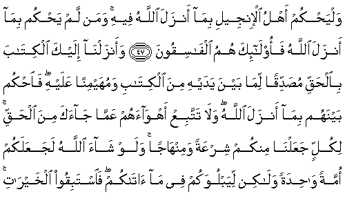 47. İncil sahipleri Allah'ın onda indirdikleriyle hükmetsinler. Kim Allah'ın indirdiğiyle hükmetmezse, işte onlar, fasık olanlardır.