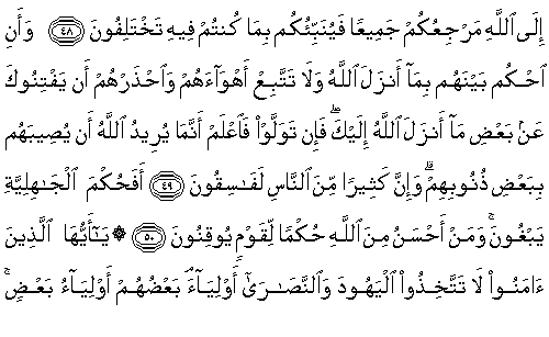 49. Aralarında Allah'ın indirdiğiyle hükmet ve onların hevalarına uyma. Allah'ın sana indirdiklerinin bir kısmından seni şaşırtmamaları için onlardan sakın. Şayet yüz çevirirlerse, bil ki, Allah bir kısım günahları nedeniyle onlara bir musibeti tattırmak istemektedir. Şüphesiz, insanların çoğu fasıklardır.