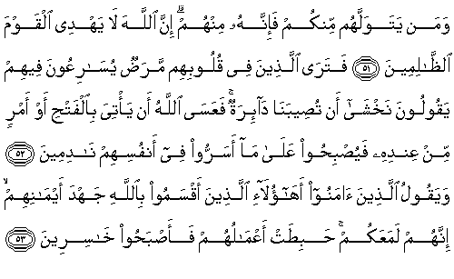 51. Ey iman edenler, Yahudi ve Hıristiyanları dostlar (veliler) edinmeyin; onlar birbirlerinin dostudurlar. Sizden onları kim dost edinirse, kuşkusuz onlardandır. Şüphesiz Allah, zalimler topluluğuna hidayet vermez.