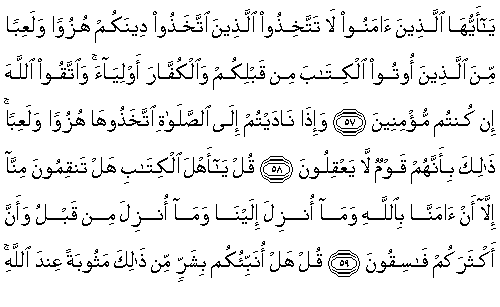 57. Ey iman edenler, sizden önce kendilerine kitap verilenlerden dininizi, alay ve oyun (konusu) edinenleri ve kafirleri dostlar (veliler) edinmeyin. Ve eğer inanıyorsanız, Allah'tan korkup-sakının.
