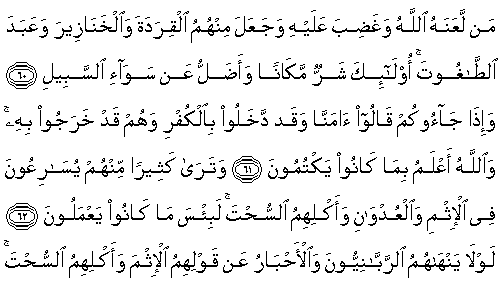 60. De ki: "Allah Katında, 'kesinleşmiş bir ceza olarak' bundan daha kötüsünü haber vereyim mi? Allah'ın kendisine lanet ettiği, ona karşı gazablandığı ve onlardan maymunlar ve domuzlar kıldığı ile tağuta tapanlar; işte bunlar, yerleri daha kötü ve dümdüz yoldan daha çok sapmışlardır."