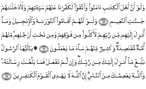 65. Eğer, Kitap Ehli iman edip sakınsalardı, elbette onların kötülüklerini örter ve onları 'nimetlerle donatılmış' cennetlere sokardık.