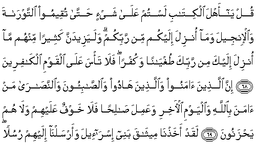 68. De ki: "Ey Kitap Ehli, Tevrat'ı, İncil'i ve size Rabbinizden indirileni ayakta tutmadıkça hiçbir şey üzerinde değilsiniz." Andolsun, Rabbinden sana indirilen, onlardan çoğunun tuğyanlarını ve inkarlarını artıracaktır. Sen de kafirler topluluğuna karşı üzüntüye kapılma.