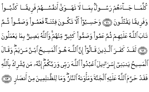 72. Andolsun, "Şüphesiz Allah, Meryem oğlu Mesih'tir" diyenler küfre düşmüştür. Oysa Mesih'in dediği (şudur:) "Ey İsrailoğulları, benim de Rabbim, sizin de Rabbiniz olan Allah'a ibadet edin. Çünkü O, Kendisi'ne ortak koşana şüphesiz cenneti haram kılmıştır, onun barınma yeri ateştir. Zulmedenlere yardımcı yoktur."